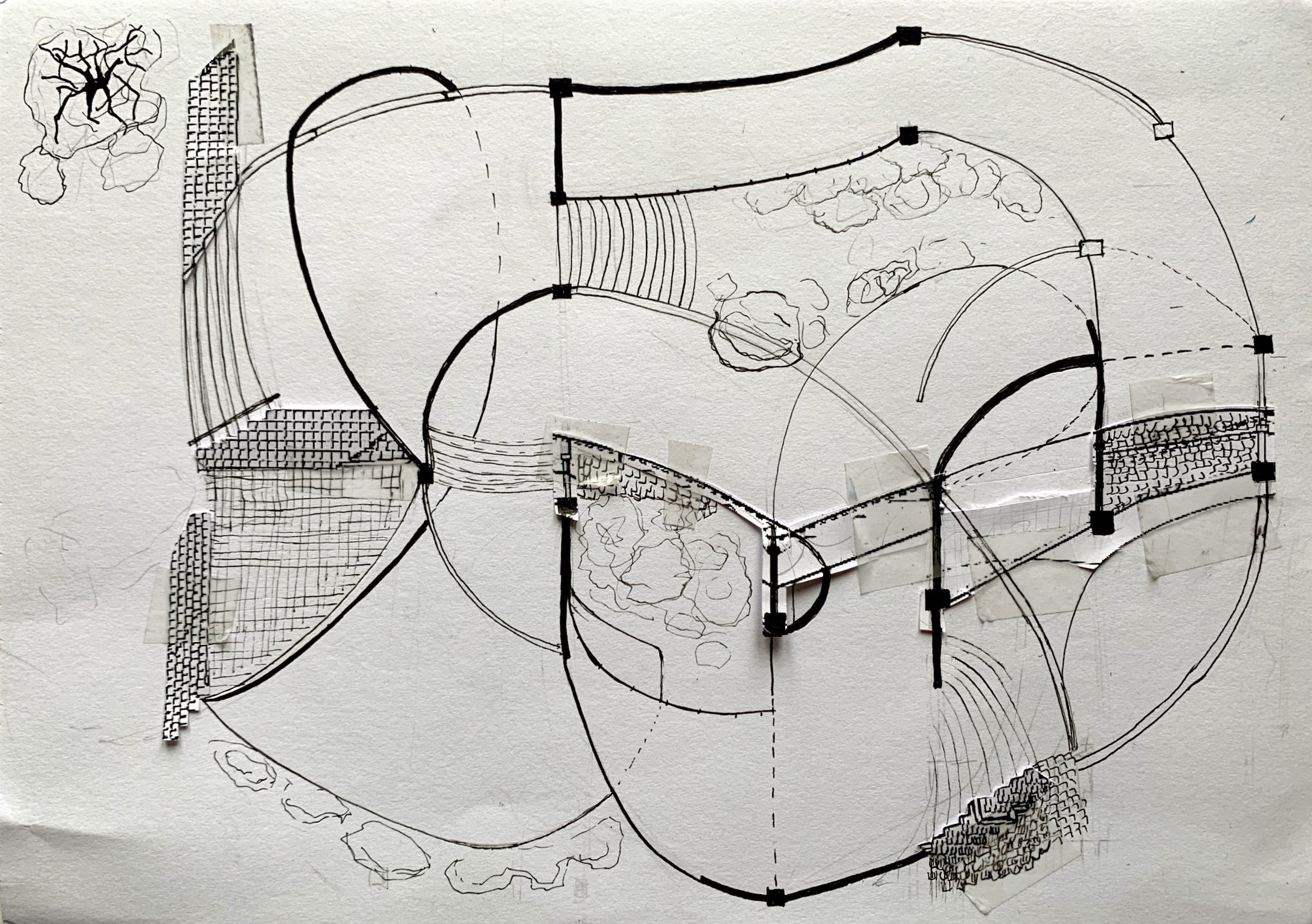 Elements of the building were blown away, but could not break. Invisible threads between the structural elements held them together. This newly exploded space was taking its passengers around, taking them to countless venues. Each player had a different journey according to the point he stepped into the venue. While some thought he was wandering on a roof, he was actually walking around the seats of a concert hall! The drawing was neither a section nor a plan, and if the plan was a section, it was the ‘eye’ of the viewer that is shown in this drawing.