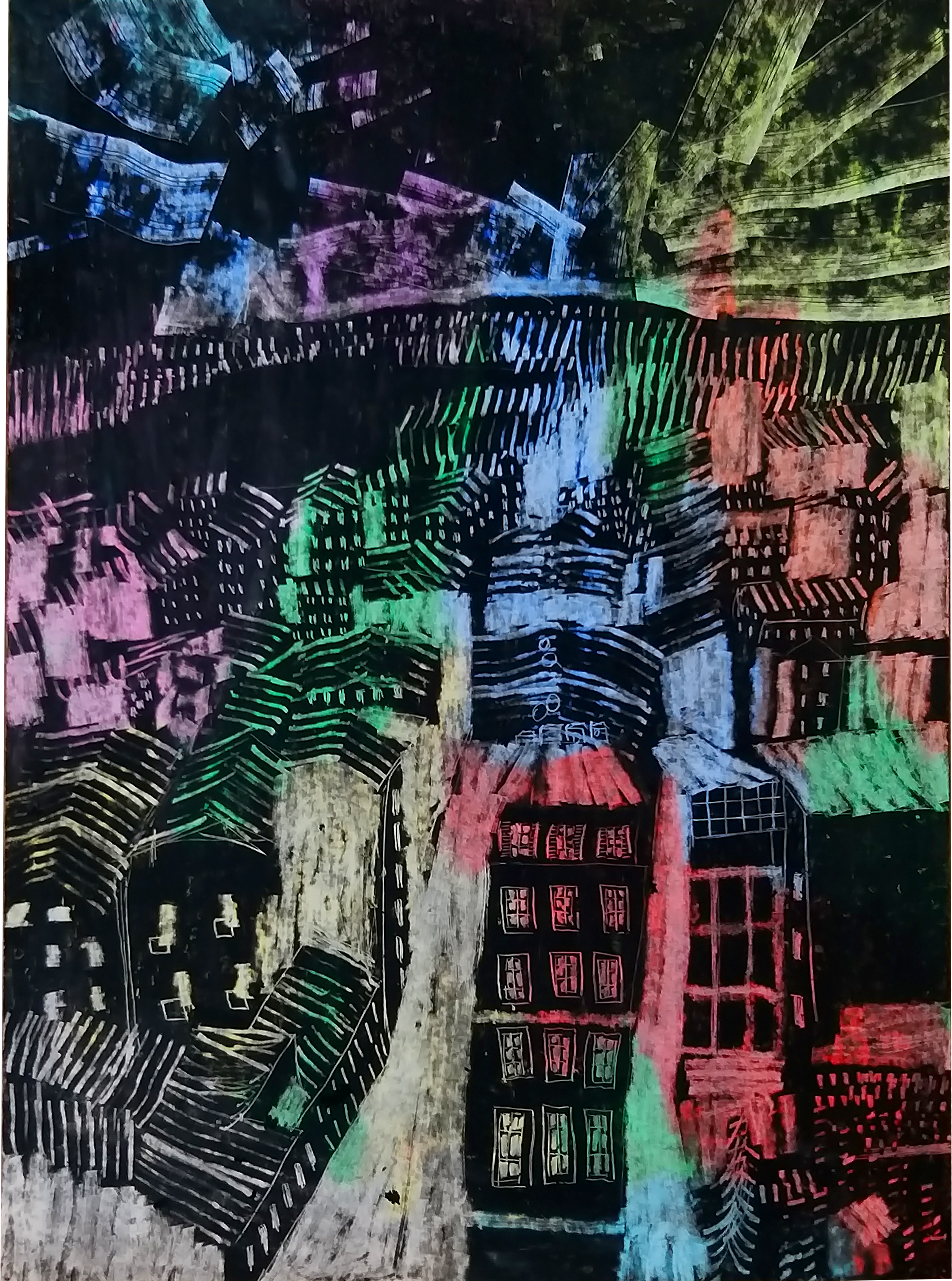 The size of the tool I use helps me establish perspective perception on paper. Clouds are scratched with large surfaces and structures on the horizon with finer-tipped surfaces or the corners of tools.